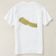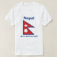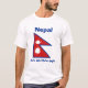 An editable title and slogan accompanies the white symbols on an ireegularly shaped red background with blue border of the Nepalese flag on the front of this t-shirt. The back displays a detailed map of Nepal.