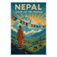 Retro vintage travel poster of Nepal, celebrating its title as the Roof of the World.