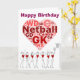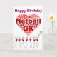 Netball positions greeting card template with love heart and stick figures. Custom happy birthday card for netball player or fan.
