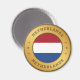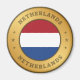 The Netherlands flag is inset into a rounded faux gold ring. The word "Netherlands" feature at the top and bottom of the design, and are of a pressed effect. The pair of three decorative stars across from each other, are also designed with a pressed effect.