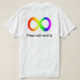 The front of the shirt says "nothing about us without us" and the back has the neurodiversity infinity rainbow symbol and the word "neurodiversity". We are not lesser than abled neurotypical people, we are different and that's okay. Be proud of who you are. We have to fight to have our voices heard. Disabled people are far too often excluded from the conversation about disability. It's not right, and honestly a bit ridiculous. Who knows what we need better than we do? Don't be ashamed of your disability, it's part of you like any other thing is. We need acceptance, not awareness.