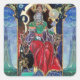 Colourful, vibrant , contemporary painting in gold ,blue,red,green,brown colours . A mysterious hypnotic sorcerer with elegant gorgeous red velvet costumes holding a magic sphere sitting on a gothic throne with gargoyles and an owl. Ambient is surreal,fantastic ,alchemic where you see a jester is drinking from a cup, a templar monk flying on a frog,transparent bubbles,fantasy landscapes with hell fire,cosmic blue sky with stars , mountains of heaven,trees .Egg Tempera on wooden panel with golden foil. 1989 , Miniature Made with pictorical techniques of 1300 by Alessandro Lumini (c) It is also a beautiful fantasy design for Christmas,Holiday,Birthday,New Year's Eve day, Mardi Gras and Carnival greetings.