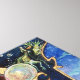 Colourful, vibrant , contemporary painting in gold ,blue,red,green,brown colours . A mysterious hypnotic sorcerer with elegant gorgeous red velvet costumes holding a magic sphere sitting on a gothic throne with gargoyles and an owl. Ambient is surreal,fantastic ,alchemic where you see a jester is drinking from a cup, a templar monk flying on a frog,transparent bubbles,fantasy landscapes with hell fire,cosmic blue sky with stars , mountains of heaven,trees .Egg Tempera on wooden panel with golden foil. 1989 , Miniature Made with pictorical techniques of 1300 by Alessandro Lumini (c) It is also a beautiful fantasy design for Christmas,Holiday,Birthday,New Year's Eve day, Mardi Gras and Carnival greetings.
