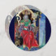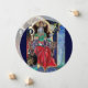 Colourful, vibrant , contemporary painting in gold ,blue,red,green,brown colours . A mysterious hypnotic sorcerer with elegant gorgeous red velvet costumes holding a magic sphere sitting on a gothic throne with gargoyles and an owl. Ambient is surreal,fantastic ,alchemic where you see a jester is drinking from a cup, a templar monk flying on a frog,transparent bubbles,fantasy landscapes with hell fire,cosmic blue sky with stars , mountains of heaven,trees .Egg Tempera on wooden panel with golden foil. 1989 , Miniature Made with pictorical techniques of 1300 by Alessandro Lumini (c) It is also a beautiful fantasy design for Christmas,Holiday,Birthday,New Year's Eve day, Mardi Gras and Carnival greetings.