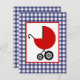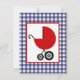 A baby shower invitation featuring an illustration of a red baby carriage over a background of blue gingham. Personalise the text on back with details of your occasion.