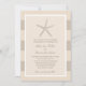 The "Shoreline Chic" wedding invitation in a 5 x 7 portrait format features stylish beachy cabana stripes, a starfish illustration, and neutral beige, sand, and taupe brown colour scheme. Simple and elegant style, perfect for a seaside wedding destination.