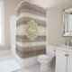 A neutral brown knit pattern shower curtain with lacy tan stripes that you can personalise by adding your name and monogrammed initial to. This is part of the Emperador and Warm Sand Knit Collection. Flat printed image NOT made with yarn or lace.