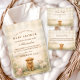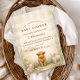 A charming countryside design featuring a fluffy calf, a sweet little lamb, and tiny yellow chicks nestled among soft meadow wildflowers. The warm parchment background and muted earth tones create a cosy, rustic atmosphere with a gentle storybook feel. Delicate greenery frames the layout while the farm animal illustration adds warmth and personality. Perfect for a neutral rural-themed celebration with classic farmhouse charm.