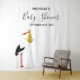 A stork holding a golden baby. Gender neutral, baby boy or baby girl. A clean white elegant background for a baby shower photo backdrop. Template for the mum to be's name and the date. Black letters. The text: Baby Shower is written with a modern and trendy hand lettered style script.