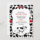 Neutral Red Black Cow Print Baby Shower Invitation. Design features a cute graphic of a cow, red and black bow, cow print background, and red ribbon. Neutral design for girls or boys.