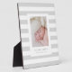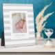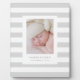 This neutral design features white rugby stripes and a framed photograph with custom name and birth details.