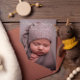 Photo birth announcement personalised with a big photo on the cover and three more photos on the back. Your baby's name in a white signature script along with their last name at the top, and birth stats at the bottom. Beautiful new baby announcement that works for both boys and girls.