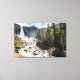 This photo features late winter at Nevada Falls is in full flow and the water thunders off the cliff face and takes up again in the merced river as it passes rocks and fir trees.