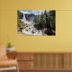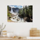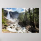 This photo features late winter at Nevada Falls is in full flow and the water thunders off the cliff face and takes up again in the merced river as it passes rocks and fir trees.