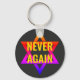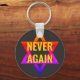 Black NEVER AGAIN Holocaust Remembrance keychain, showing multicolored Star of David and the yellow wording NEVER AGAIN.