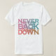 This dynamic t-shirt features the bold phrase "Never Back Down" in vibrant, multi-coloured letters, set against a motivating, abstract background. The geometric design and energetic colour scheme create a visually striking and inspiring piece, perfect for those who embrace resilience and determination