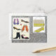 purple,black,brown,chartreuse and red shoes with a matching bag on a white shaggy background. matching mug,note card and postage stamps.