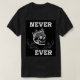 This design features a black-and-white graphic with bold, capitalised text reading "NEVER" at the top and "EVER" at the bottom. In the centre, there's a detailed, monochromatic illustration of a skull wearing an ornate crown with intricate patterns, symbolising a dark or rebellious theme. The skull and crown are flanked by stylised floral elements on both sides, adding a softer contrast to the edgy central image. The design has a tattoo-like aesthetic, blending gothic and vintage elements, and the high contrast against the black background gives it a strong, impactful look.
