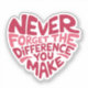 The phrase "Never Forget the Difference You Make" is a powerful reminder of the impact we can have on the world around us. It encourages us to recognise the positive influence our actions, words, and presence can have on others. Whether it's a small gesture of kindness or a significant contribution to a cause, every individual has the potential to make a difference.