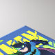 Check out this cartoon graphic of Batman running, featuring his name in electric colors behind him and the words "Never Give Up" along the bottom.