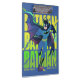 Check out this cartoon graphic of Batman running, featuring his name in electric colours behind him and the words "Never Give Up" along the bottom.