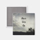 This inspirational magnet features a photo that captures an evening landscape with the sun's rays breaking through the grey and white clouds. The land appears in black silhouette along with the branches of a distant tree. The sunbeams create diagonal lines across the two-tone sky. "Never Give Up" appears in black font to give this magnet a motivational message which can easily be customised if you desire.