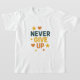 Empower your day with this vibrant “NEVER GIVE UP” graphic tee. Designed with bold typography and uplifting colours, this shirt is perfect for anyone who needs a daily dose of motivation. Featuring deep blue, bright yellow, and warm orange text surrounded by playful stars and hearts, it’s a wearable reminder to stay strong and keep pushing forward.