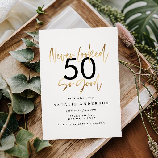 never looked so good gold effect birthday invitation. Modern script text monochrome design. Part of a collection.