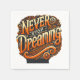 A visually striking, motivational graphic featuring the phrase "Never Stop Dreaming" in bright orange typography. Set against a solid black background, the vibrant colours and ornamental details make the composition energetic and uplifting. This is an artistic and motivational design perfect for t-shirts, mugs, napkins, posters, and merchandise, combining bold fonts and decorative elements to inspire positivity.