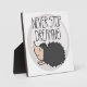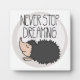 Cute postcard with cartoon flat hand drawn hedgehog and inspirational and motivational quote Never Stop Dreaming in a circle light blue frame on a white background. | Bigstock® - All Rights Reserved.