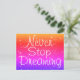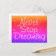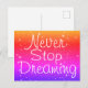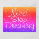 A colourful, positive affirmation to keep you focused on your goals. ‘Never stop dreaming’ is written in a handwriting-style font with a rainbow, star background.