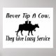 Yeah I have had plenty of cows bring me my food and drink and they never come back to see if I need anything else. Don't ever tip a cow because they give terrible service! Featuring a cow with bell on, delivering food and drink upon a tray on his back.