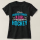 Text of white, hot pink, and blue reads Never Underestimate a Girl Who Plays Hockey on female hockey player items sure to please any girl who loves the sport of hockey. Also features pucks and hockey sticks!