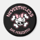A cute, snarling, pirate skull and crossbones, with a pink bow and, "Nevertheless, she persisted" text. T-shirts, sweats, stickers, buttons, gifts.