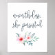 Let her speak! Adorn your walls with some feminist motivation and inspiration to lead. Our typography quote poster print features "nevertheless, she persisted" in slate blue handwritten style calligraphy script lettering adorned with a spray of pink and sage watercolor flowers. A perfect gift for the feminist or Elizabeth Warren supporter in your life!