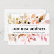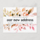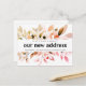 Autumn colours have changed green leaves to pink, orange, and brown on the floral bouquet on front of our new address announcement postcard. Lower case typography for your new home announcement text on front of the card gives a natural touch to complement the botanical design. All example text on front and back of the card can be easily revised with your personal greeting and contact details.
