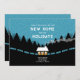 Trendy change of address announcement in blue, featuring a cosy little cabin in the woods with windows and a retro style forest with pine trees and snow.