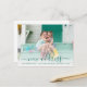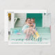 Let friends and family know your new address with these personalised photo moving announcements. Easily replace the sample image with a horizontal photo of your family enjoying your new home. The words "new address" appear in elegant teal blue-green handwriting script with swashes before and after. Add your new address below in teal sans serif font and on the back in black. A white gradient filter helps make the text pop.