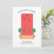 It is decorated with a watercolor of a red door, pots of topiary, and Our New Home in stylish typography.