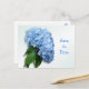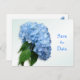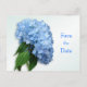 Save the date postcard, blue hydrangea wedding theme.  Affordable cards with light blue flowers on the front.