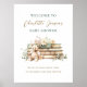 Elegant "A new chapter" baby shower welcome sign poster features a stack of beautiful vintage hardcover books adorned with pastel pink and blush flowers, and a sweet little teddy bear. Personalize the golden bronze and rich green text with the mother's name and a custom note of appreciation for attending guests.