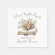 A sweet paper napkin for a baby or bridal shower with a book-themed celebration. The design features the phrase “A New Chapter Begins” in an elegant swirl script paired with classic serif fonts, along with a watercolor illustration of an open vintage book. Delicate wildflowers bloom from inside the book in a soft mix of blush pink, yellow, periwinkle blue, and subtle hints of orange red, creating a warm and whimsical look.
