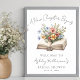 A charming welcome sign for a baby or bridal shower inspired by the “A New Chapter Begins” theme. Centered on the sign is a watercolor open vintage book with delicate wildflowers blooming from inside in soft blush pink, yellow, periwinkle blue, and subtle hints of orange-red, creating a warm and whimsical look.