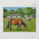 Postcard with photo of New Forest ponies and thatched cottages in painting style from New Forest Pics