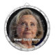 The design features Hillary Clinton. She's often a prime target and whether you love her or hate her this will be an interesting conversation piece. You can replace both the photo and text.
