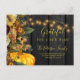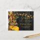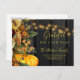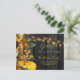 Modern rustic elegant Thanksgiving family moving announcement postcard featuring a beautiful autumn fall floral botanicals bouquet with pumpkin and a gold chic typography script over a dark brown barn wood background.
