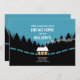 Change of address announcement in blue, featuring a cosy little cabin in the woods and a retro style forest with pine trees.