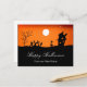 New home postcard with a black and orange haunted house and with design and script typography. With white customisable lettering, you can add your own information. Great for letting everyone know about your new location while wishing them a Happy Halloween!