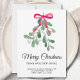 Are you moving to a new home this festive season? This festive moving announcement card lets family and friends know your new address. It is decorated with watercolor mistletoe, red ribbon, and Merry Christmas in elegant typography.