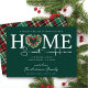 This festive moving announcement features the saying "Holiday Greetings from Our New Home Sweet Home" with a holly and berry heart wreath set on a green background. The announcement is perfect for sending to friends and family during the holiday season to let them know about your new address. The front of the announcement features the saying and wreath, and the back of the announcement has a coordinating